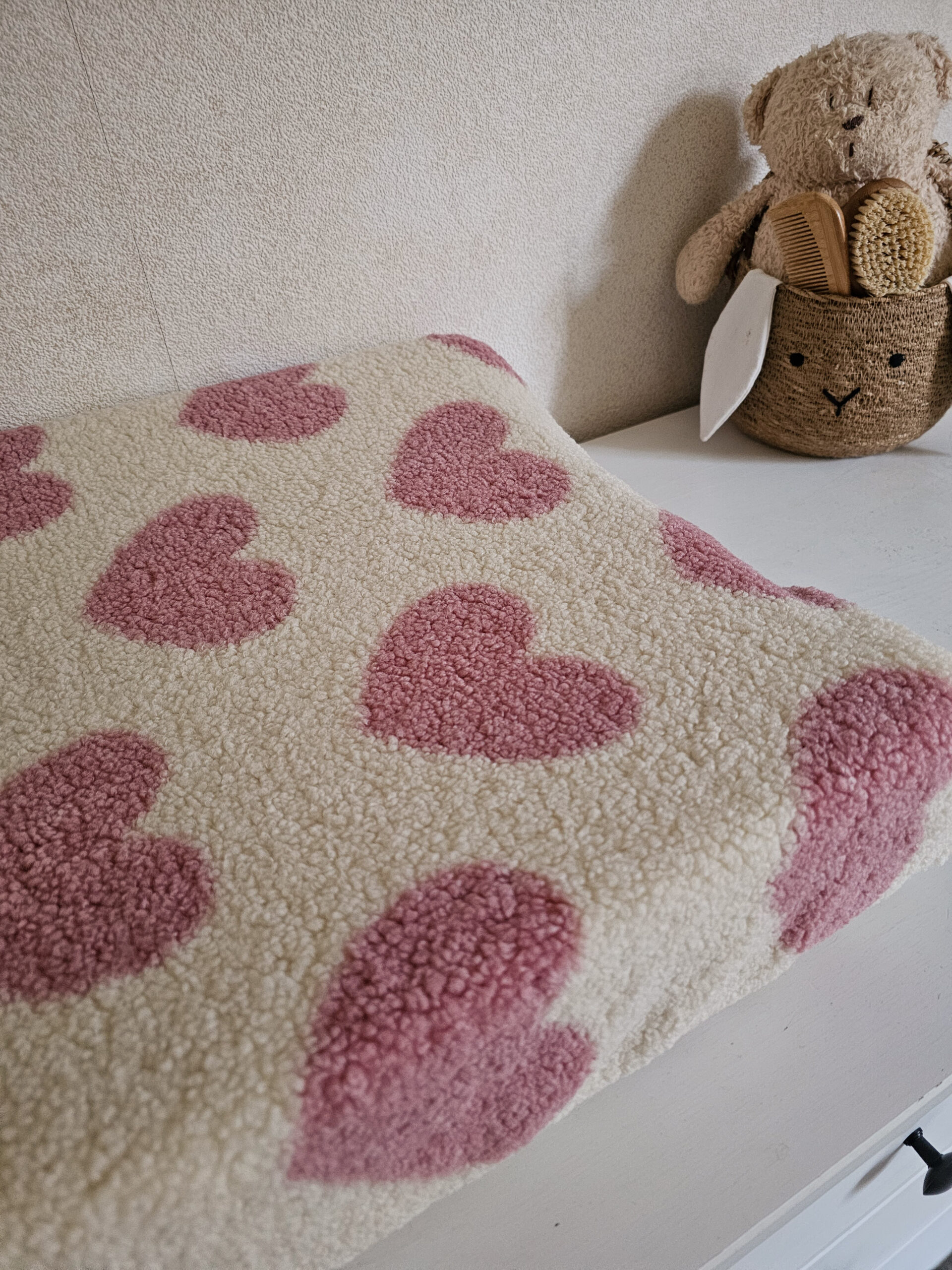 Aankleedkussenhoes -Teddy hartjes pink+Swaddle - konijntjes - L 120x120 cm+Swaddle  zand 3 maten
