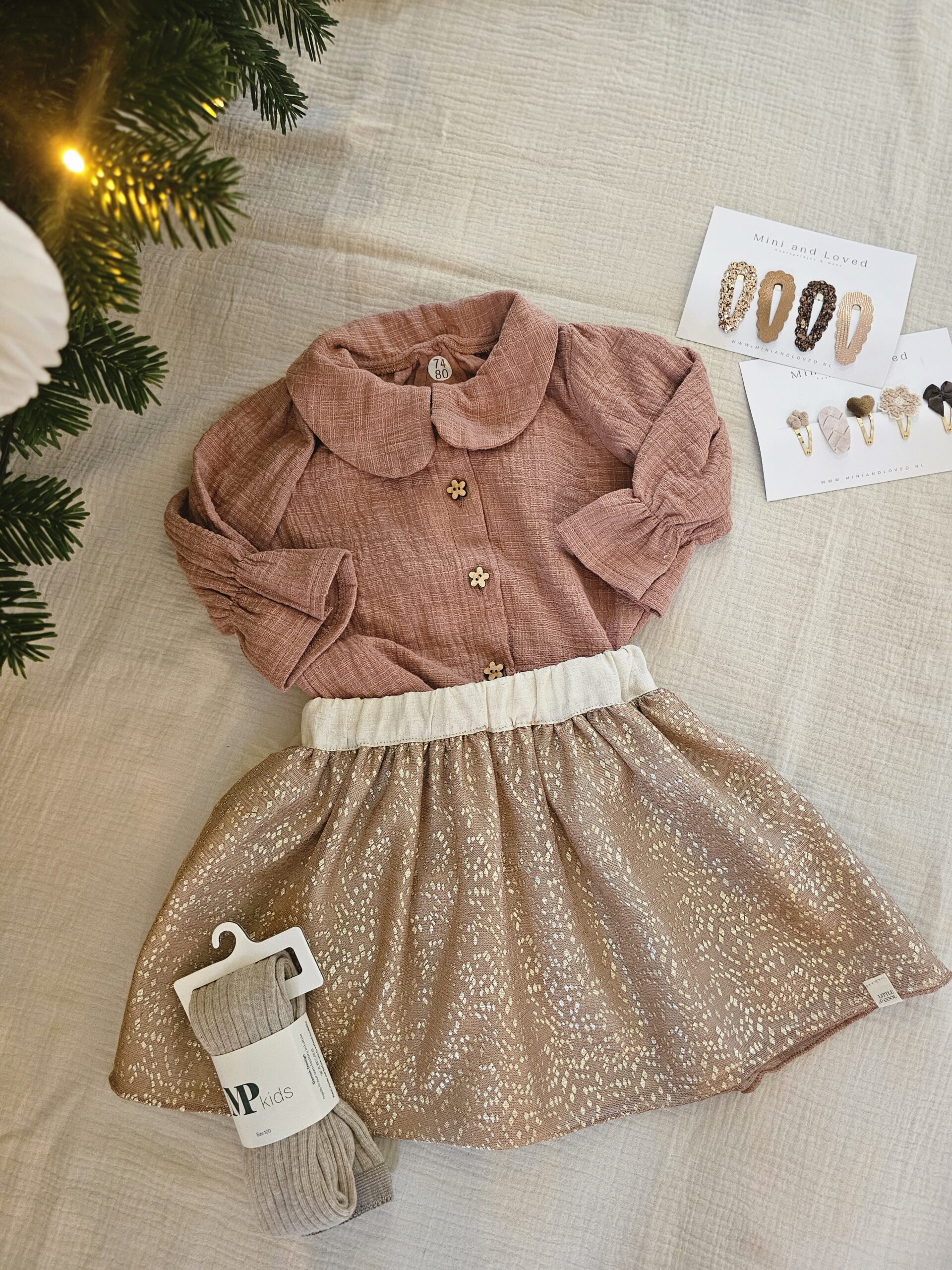Rokje -tu tu glitter - 62/68+Blouse mousseline linnen klei roze - 74/80+Marley tights - cotton rib tights beige melange 108 - 90